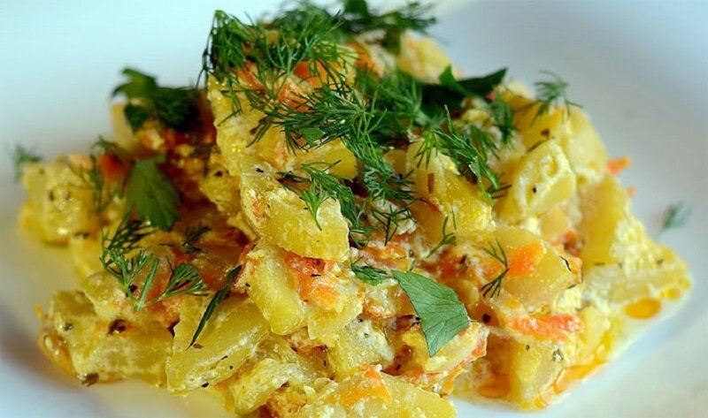 Далее нужно влить сметану и перемешать все ингредиенты. Закрыть сковороду крышкой и тушить на минимальном огне около 5 минут, периодически помешивая. После этого стоит дать блюду «отдохнуть» на выключенной плите под крышкой примерно 10 минут, после чего оно готово к подаче.
