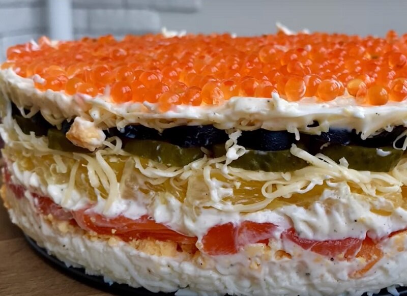 Перед подачей посыпьте салат красной икрой, а по желанию украшайте свежей зеленью. Ваше кулинарное произведение станет настоящей изюминкой любого торжества!
