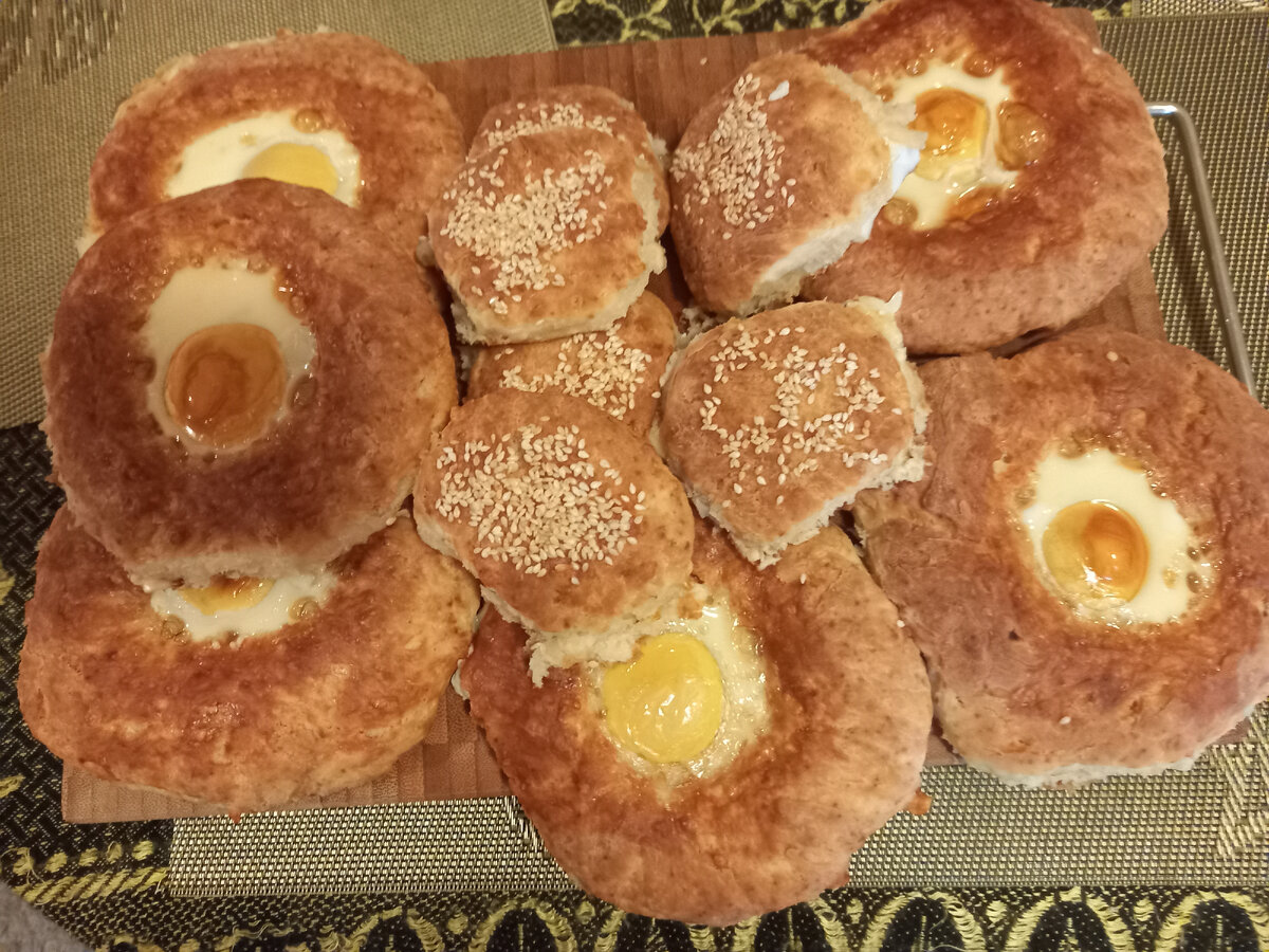 Готовое тесто делим на 6 частей и раскатываем их в лепешки. В каждой лепешке вырезаем серединку, формируя кольца. Подготавливаем противень с бумагой, смазанной маслом, и выкладываем кольца, в центр каждого помещая яйцо. Не лишним будет немного посолить и поперчить, хотя это не обязательно.