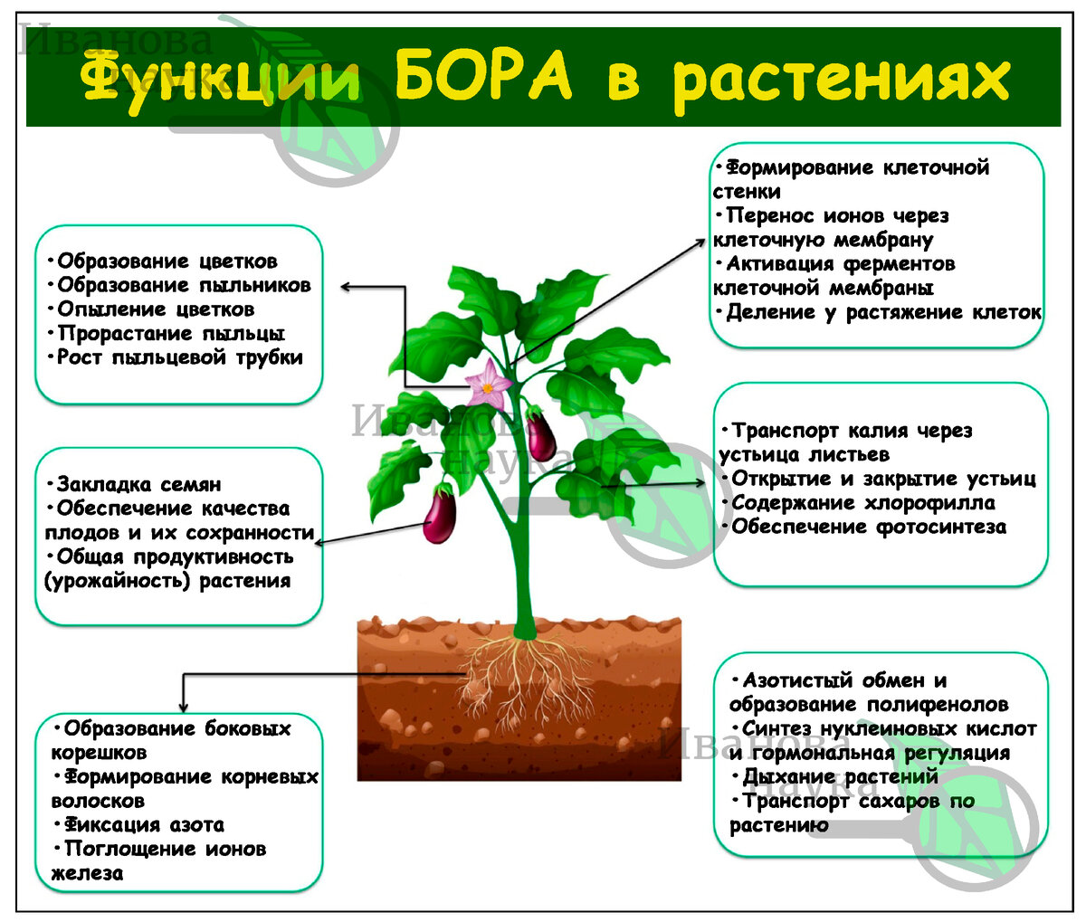 Бор (B) — важнейший микроэлемент для растений, необходимый для их полноценного роста. Он влияет на обмен веществ, клеточное деление и транспорт веществ внутри растения. При его недостатке растения сталкиваются с различными проблемами, включая замедление роста, потерю хлорофила и даже гибель. Однако чрезмерное количество бора также может привести к токсичности. Поэтому профицит и дефицит этого элемента — распространенные сложности, особенно в условиях засухи или при выращивании в горшках и контейнерах.