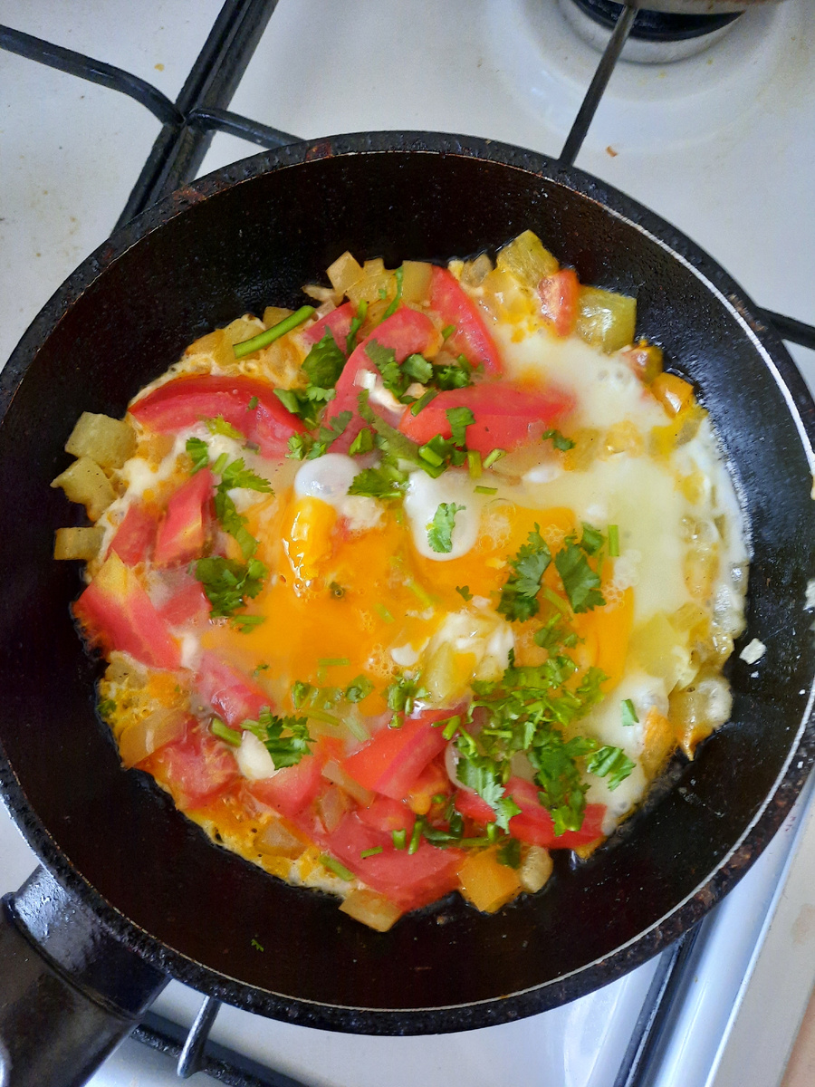 Разогрейте одну ложку сливочного масла на сковороде и обжарьте мелко нарезанные лук и болгарский перец. Спустя несколько минут добавьте порезанные дольками помидоры (чистить от кожицы необязательно). По вкусу подсолите и поперчите, а затем вбейте яйца, которые не должны полностью зажариваться, сохраняя текучесть желтка. Подавайте с хрустящим белым хлебом.