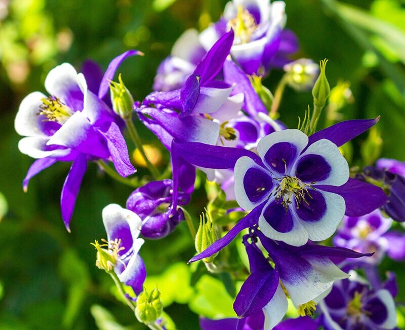 - Аквилегия: Обладает необычными синими, белыми и лимонными бутонами, достигает 60 см в высоту.
