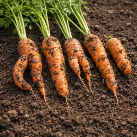 Даже небольшой камень, попавшийся на пути, может изменить форму моркови. Корни упираются и делятся на две части либо начинают двигаться вбок. А если в почве остались старые корни от предшествующих растений, это тоже может стать причиной искривлений. Кроме того, свежая органика, как неперепревший компост или навоз, делает морковь более чувствительной, что может вызывать боковые ответвления и неровности.
