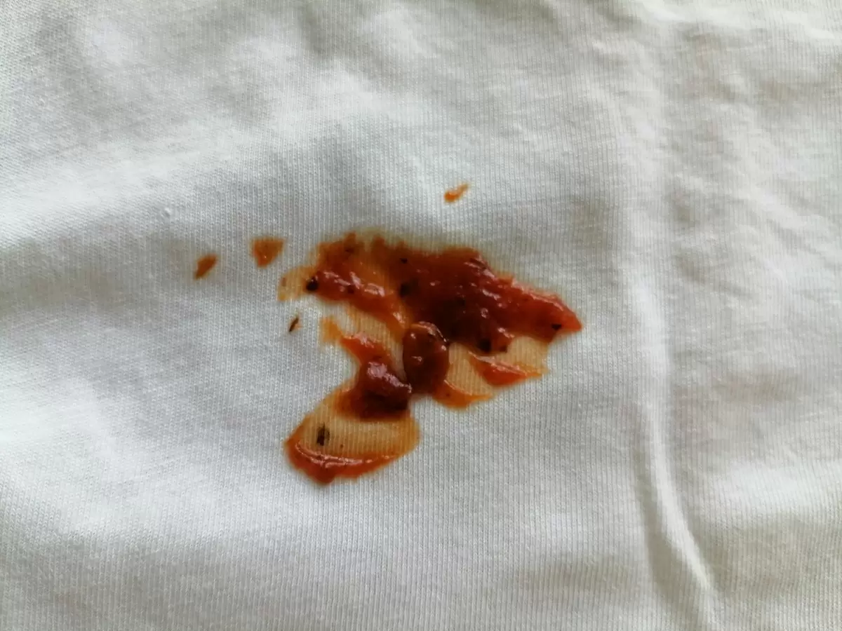 - Коварное сочетание: жиры и пигменты, содержащиеся в кетчупе и других соусах, оставляют не только цветные, но и жирные пятна.