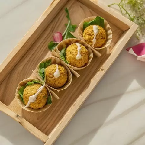 - Фалафель в мини-лепешках с тахини: Нут, пряности и свежая зелень, завернутые в мягкие лепешки — это идеальный выбор для легкого перекуса.