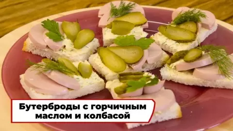 Теперь начинается самый интересный этап! Нанесите подготовленную масляную смесь на ломтики хлеба, а затем уложите колбасу и огурцы. Завершите оформление зеленью — и готово!