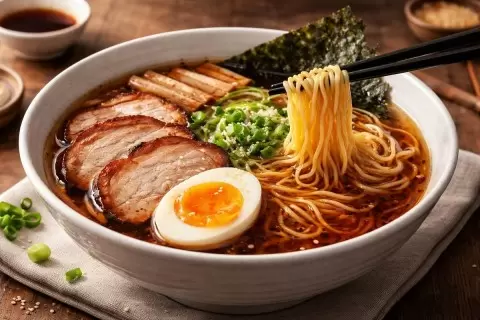 - Шою рамен: Этот вид, родом из Токио, стал символом рамена. Прозрачный коричневый бульон, приготовленный на курином или свином бульоне с добавлением соевого соуса, делает его сбалансированным и деликатным. Лапша средней толщины идеально сочетается с традиционными топпингами, такими как свинина, бамбук и вареное яйцо.