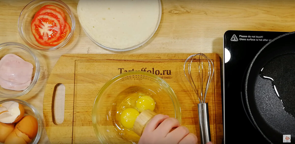 В небольшой миске нужно разбить два яйца, приправить их щепоткой соли и перца. Для получения однородной массы яйца следует тщательно взболтать венчиком. Как только смесь станет однородной, ее нужно вылить на разогретую сковороду, равномерно распределив по всей поверхности.