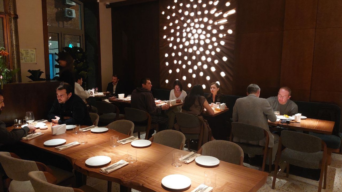 Интерьер ресторана создан для уютной и дружеской атмосферы, с плотной рассадкой и общими столами, что способствует общению и обмену впечатлениями. Деревянные элементы акцентируют единение с природой, а столы из слэбов карагача и современные инсталляции, символизирующие нейропотоки, добавляют оригинальности.